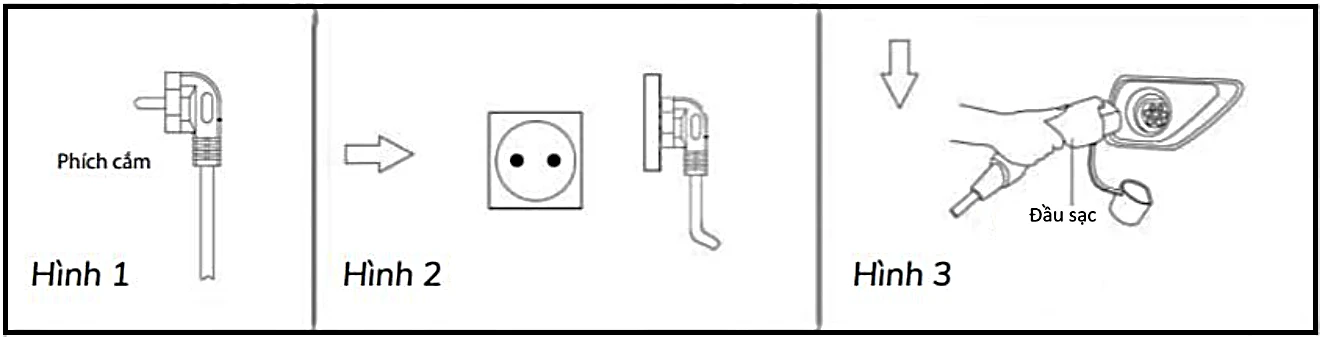 Bước 2: Mở nắp sạc xe điện, cắm đầu sạc vào cổng sạc trên xe (Hình 3). Bộ sạc tự động sạc cho xe – đèn đỏ sáng, đèn xanh nháy 1 lần/ 1 gây.