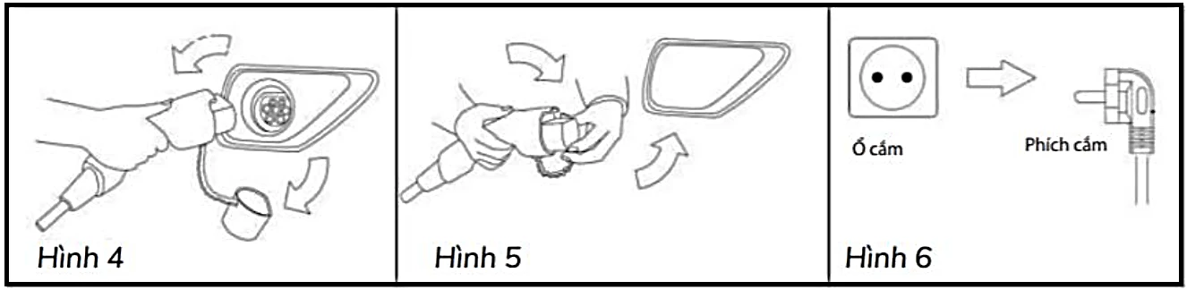 Bước 4: Rút đầu sạc ra khỏi xe (Hình 4), đóng nắp bảo vệ cổng sạc trên xe, sau đó đóng nắp bảo vệ đầu sạc của bộ sạc (Hình 5).